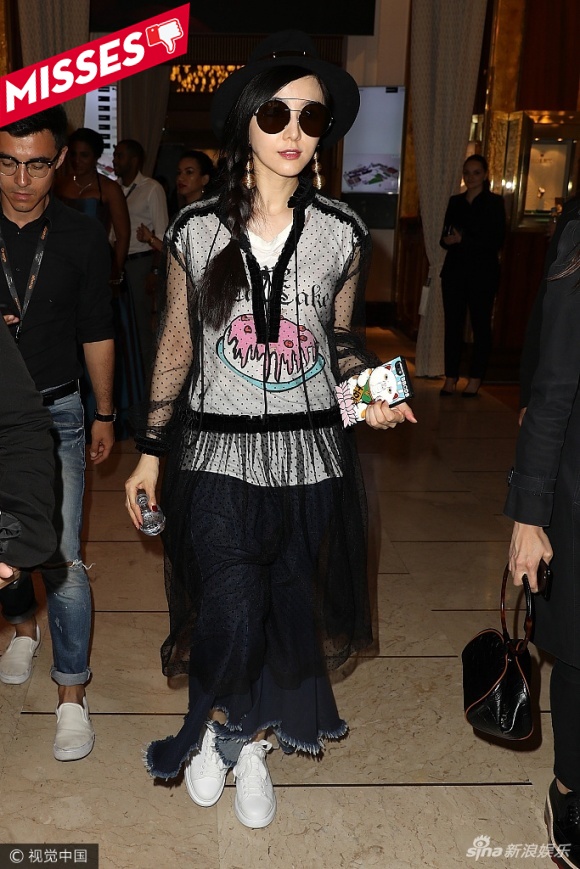 Phạm Băng Băng giảm sút phong độ với diện mạo khá luộm thuộm như thế này. Dường như trên thảm đỏ Cannes cô nàng xinh đẹp bao nhiêu thì style đời thường lại chểnh mảng bấy nhiêu. Được biết, đến tham dự liên hoan phim lần này, cô không ngại chi số tiền “khủng” để thuê ê kíp lên đến gần 20 người cho lần xuất hiện của mình. Nếu như cô nàng chịu tiết chế chi tiết và cách mix&match trên trang phục, chắc chắn sẽ không đến nỗi lọt vào bảng sao xấu tuần qua.