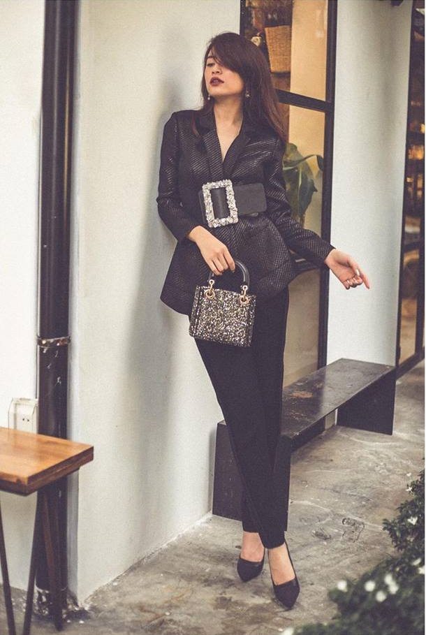 Bộ suit full đen từ đầu đến chân sang trọng và sành điệu giúp nữ ca sĩ nổi bật. Thắt lưng to bản là vũ khí giúp chia tỉ lệ cơ thể hoàn hảo, giúp chân người đẹp dài ra thấy rõ.
