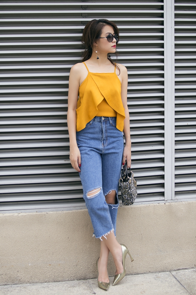 Crop-top kết hợp quần jeans và giày cao gót cũng có tác dụng giúp người đẹp trông sành điệu và “hack” chiều cao hiệu quả. Được biết, đứng đằng sau những set trang phục hoàn hảo của Hoàng Thùy Linh chính là stylist Hoàng Ku.