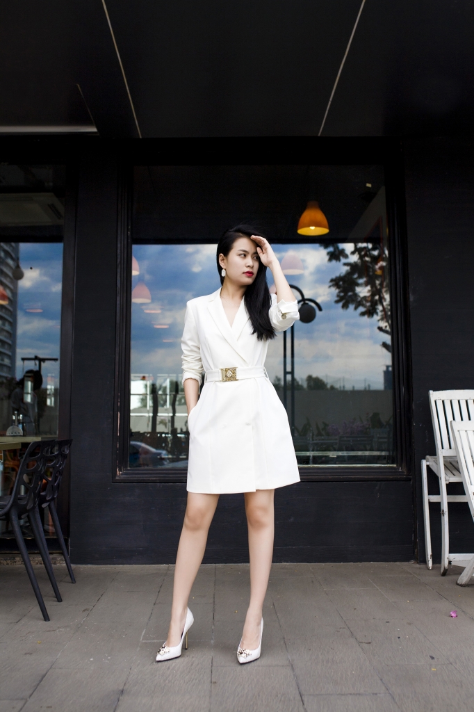 Người đẹp hóa cô nàng sành điệu và quyền lực trong kiểu đầm thắt eo theo hơi hướng menswear. Đôi cao gót cùng màu giúp 'kéo chân' hiệu quả.