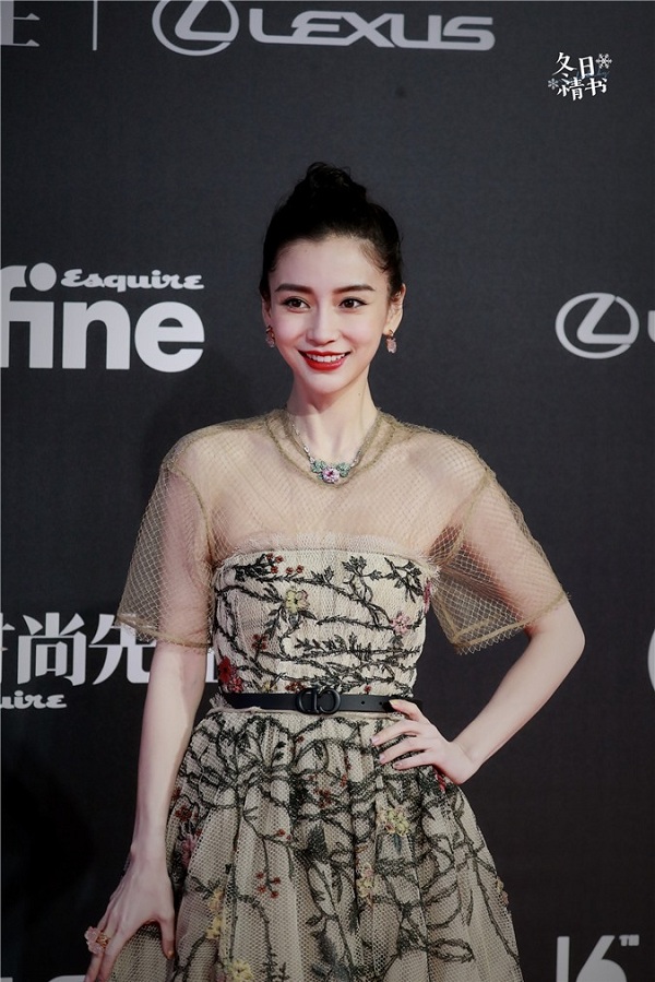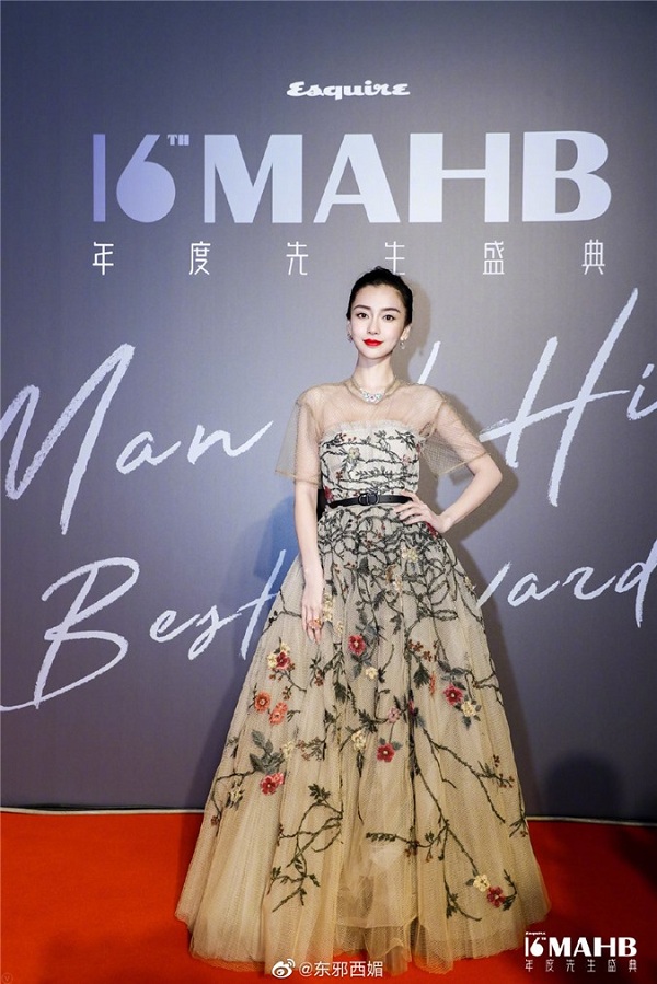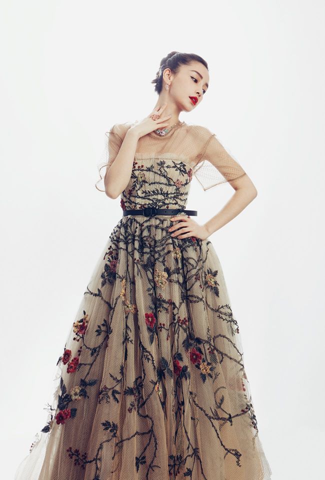 Angelababy trên thảm đỏ của sự kiện tạp chí mặc chiếc váy hoa bồng bềnh của Dior thế nhưng cô lại thắt belt ngược