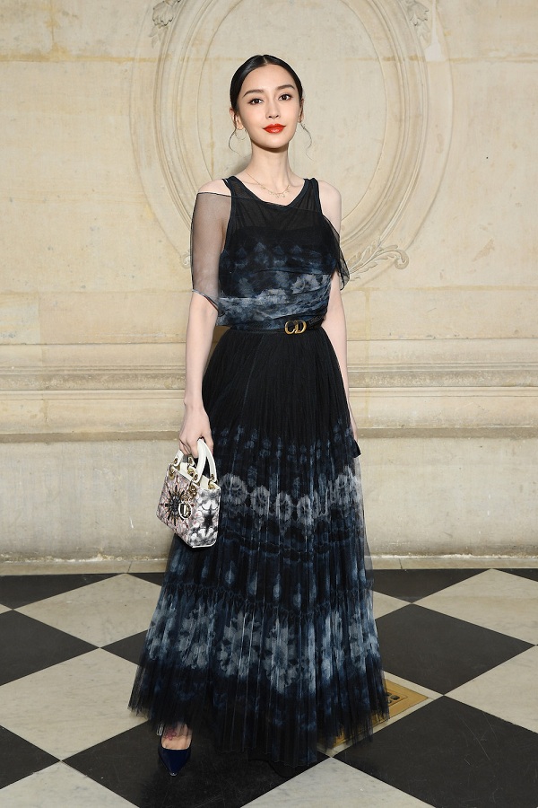Kiểu váy bồng bềnh, xếp ly công chúa thắt lưng thế này luôn là style yêu thích của người đẹp mỗi khi tham dự sự kiện thời trang, trước đó khi tham dự Tuần lễ thời trang Paris, Angelababy từng mặc kiểu váy đen xếp ly thắt belt Dior mạ vàng logo lấp lánh