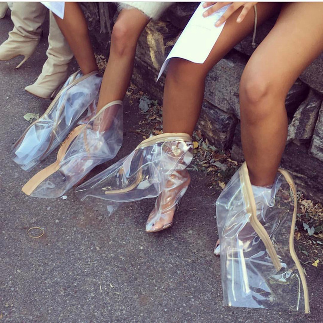 Tiếp tục với xu hướng “hot hòn họt” vào cuối năm 2016 do chính chị em nhà cô Kim “siêu vòng ba” lăng xê một thời thời - boots làm bằng nhựa PVC trong suốt. Thoạt nhìn, những đôi boots này có vẻ ngoài “ảo tung chảo”, thế nhưng chỉ trong vòng vài tiếng đồng hồ, vẻ hào nhoáng của chúng sẽ dần biến mất khi chân bạn bắt đầu đổ mồ hôi. Càng về sau, mồ hôi ra càng nhiều khiến đôi chân nhớt nháp và “toả hương” đáng sợ.