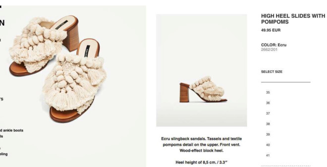 Lại một thiết kế khác đến từ thương hiệu bình dân Zara gây xôn xao cộng đồng mạng sau khi câu chuyện do fashionista Lâm Thuý Nhàn chia sẻ trên facebook cá nhân. Cô đặt mua một đôi guốc với kiểu dáng bắt mắt, đế gỗ cùng phần tua rua và bông. Tuy nhiên, đến khi nhận được sản phẩm, bà mẹ một con tá hoả vì nó nhìn như giẻ lau nhà. So với hình ảnh được đăng tải trên website chính thức của Zara, đây đích thực là một “thảm hoạ mua sắm online”.