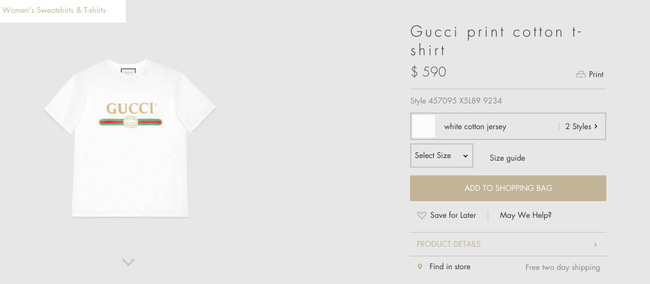 Trên trang web của hãng, mẫu áo thun trắng đơn giản phối ba sọc xanh thuộc BST Gucci Resort 2017 có mức giá 590$ - tầm 13 triệu 400 ngàn đồng, một mức giá không hề bình thường so với kiểu áo phông trắng.