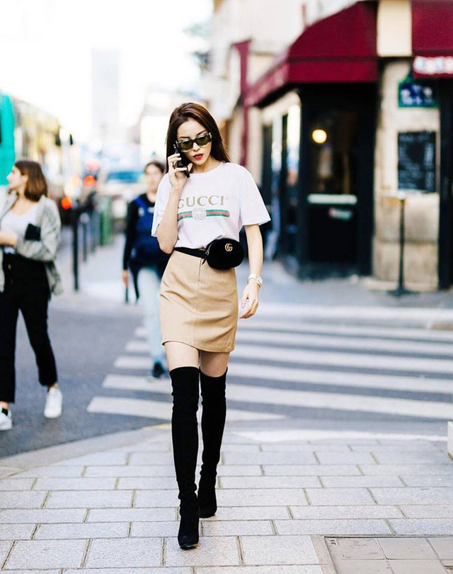 Mới đây nhất, Tâm Tít đã diện outfit bao gồm áo thun Gucci tông màu vàng chói lọi, kết hợp cùng chân váy da phối họa tiết ngôi sao. Hot girl gốc Hà Thành lựa chọn phụ kiện mũ nồi và boots cao gót xu hướng để tạo nên tổng thể cá tính, vui nhộn.