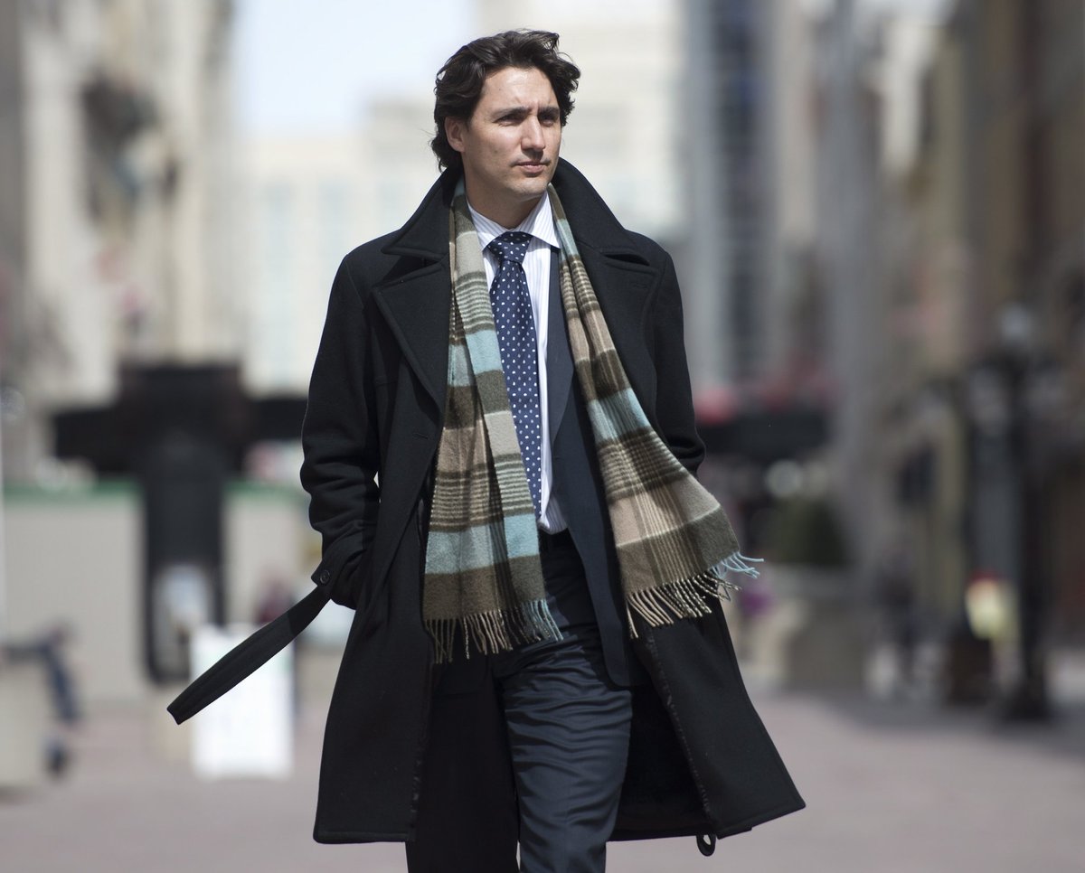 Vào mùa Đông, ông phối vest cùng măng tô, khăn choàng sọc xanh trẻ trung làm điểm nhấn. Justin Trudeau nhìn giống một người mẫu của Vogue hơn là một chính trị gia!