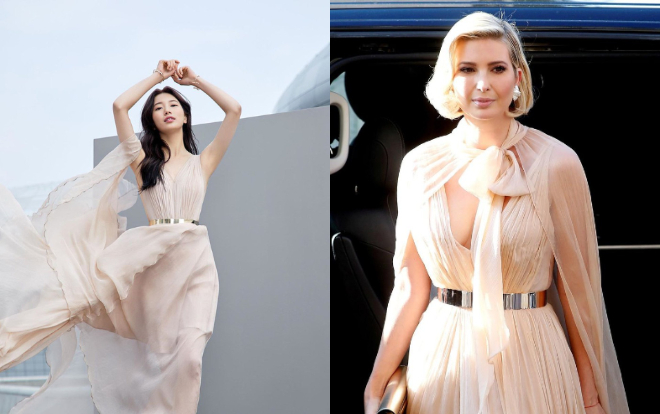 Chung một kiếu váy thướt tha, bung xòe màu be như tiên nữ đến từ nhà mốt Galia Lahav - Ái nữ Tổng thống Mỹ Ivanka Trump và “tình đầu quốc dân” Suzy đã toát lên mỗi người một vẻ đẹp riêng không ai giống ai. Nếu Ivanka trung thành với mẫu gốc khoét ngực chữ V để phô vòng một căng đầy thì cựu thành viên nhóm Miss A đã chỉnh sửa cho bộ váy trở nên kín đáo hơn.