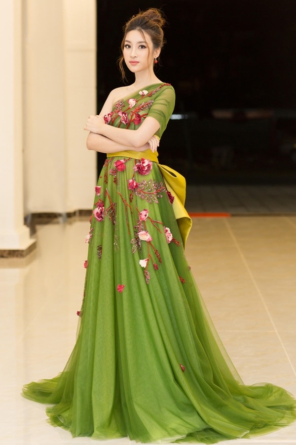 Mỹ Linh dịu dàng với đầm voan đuôi dài màu xanh lá mạ, đính kết hoa 3D của Đỗ Long.