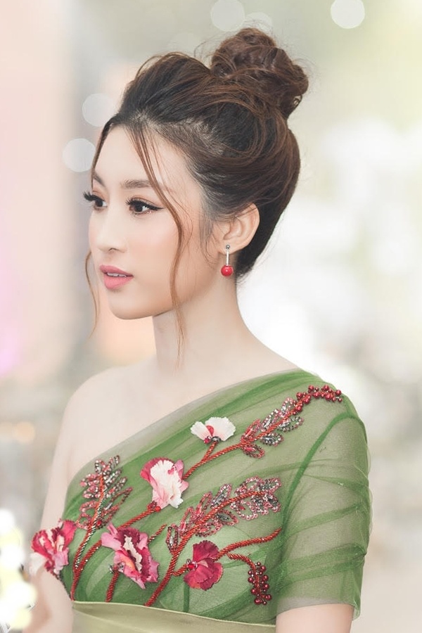 Phần trước của bộ váy có thiết kế lệch, giúp người mặc khoe vai trần. Cô để tóc búi cao, phồng nhẹ.
