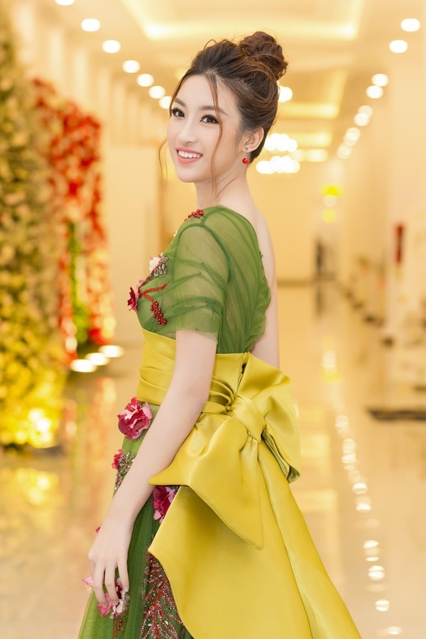 Phần thắt lưng của váy được đính nơ khổng lồ. Đỗ Mỹ Linh được xem nổi bật hơn trong thiết kế này.