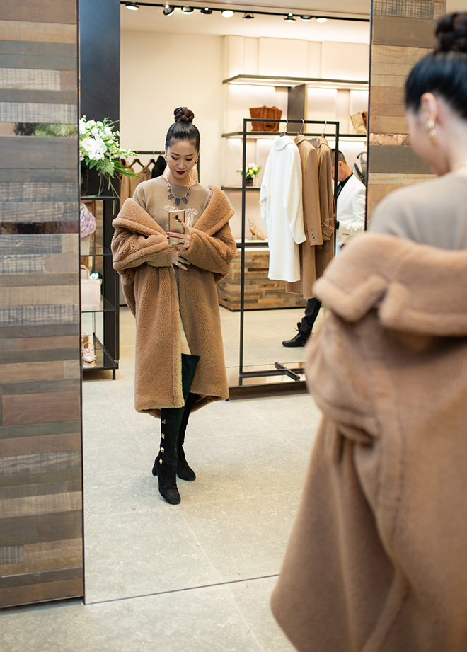 ‘Gái một con’ tiết lộ, set đồ gồm áo len, áo khoác, quần, túi xách mà cô mặc có giá khoảng 6.000 USD (gần 140 triệu đồng). Cô mix cây đồ hiệu màu camel với boots Valentino màu đen thời thượng cùng một số phụ kiện hoa tai, vòng cổ ánh kim.