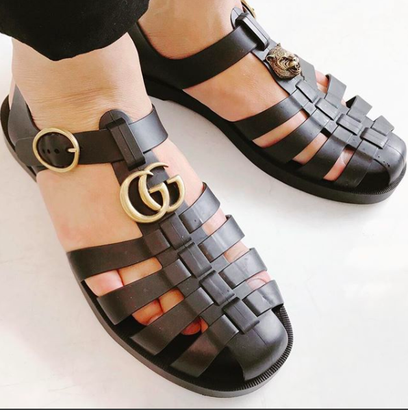 Đôi sandal có thiết kế lấy ý tưởng từ những đôi giày chiến binh với chi tiết đan đối xứng. Trên thân giày được đính logo của nhãn hàng và khóa gam màu vàng đồng tăng thêm sự sang trọng cho item này.
