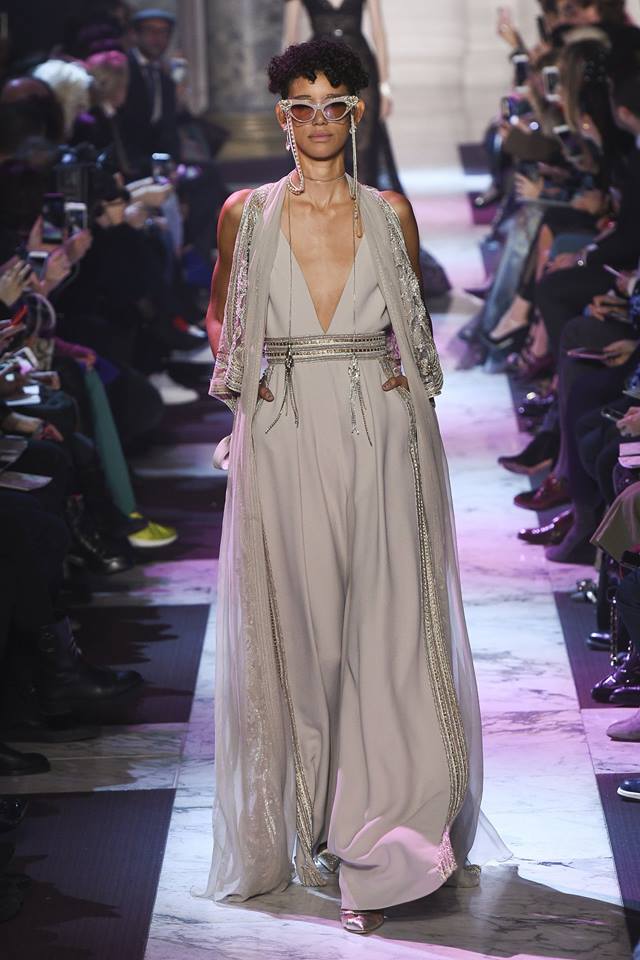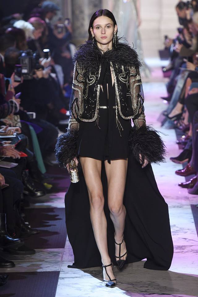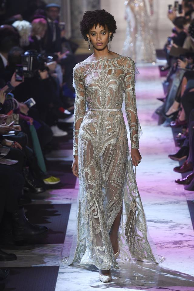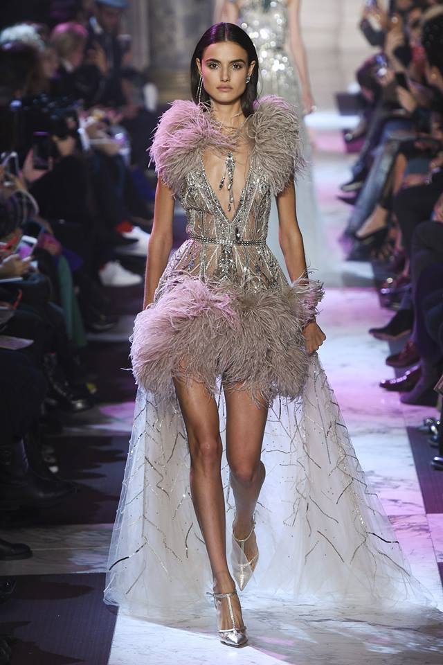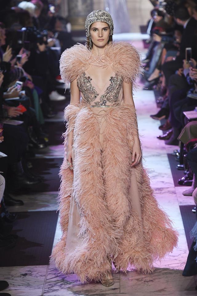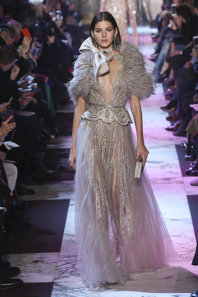 Năm nay, bên cạnh chất liệu voan xuyên thấu, Elie Saab cũng sử dụng chất liệu lông vũ để tạo nét nhẹ nhàng, thanh thoát khi người mặc di chuyển.