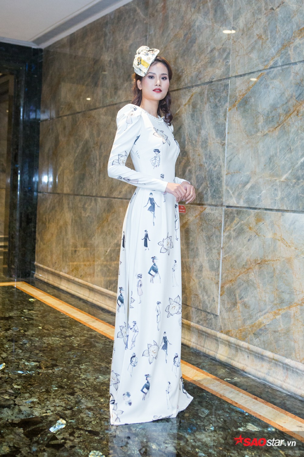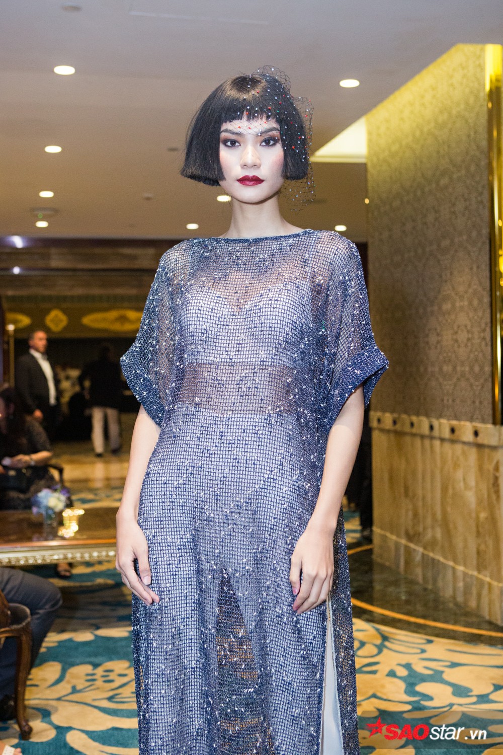 Quán quân Next Top 2017 - Kim Dung trông thời thượng với áo dài lưới xuyên thấu, lộ bra của Công Trí.