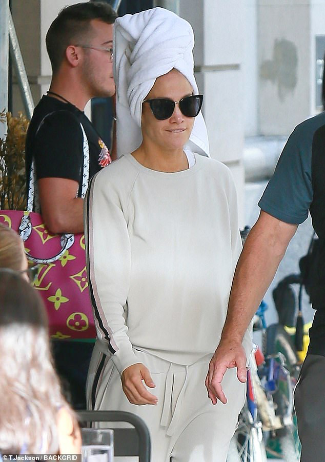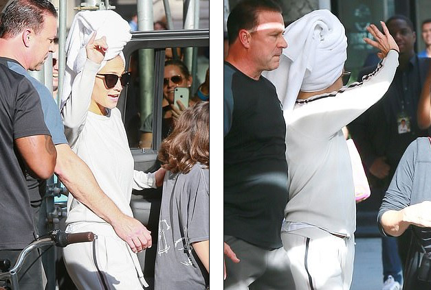Mặt mộc với làn da không tì vết cùng chiếc khăn tắm quấn trên đầu của Jennifer Lopez đã giúp cô trở thành tâm điểm trên phố