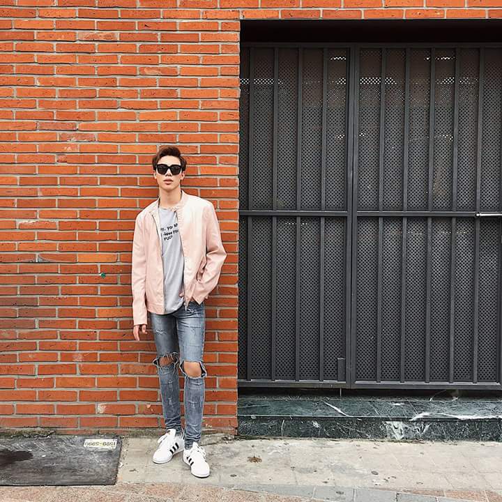 Chiếc áo khoác màu hồng da tưởng chừng khó mặc, nhưng giọng ca Ghen lại đem đến cách phối thông minh và tinh tế. Áo phông xám kết hợp ăn ý cùng giày trắng đen trung tính. Bộ đôi quần jean rách gối kèm mắt kính đen mang đến sự trẻ trung, mạnh mẽ.