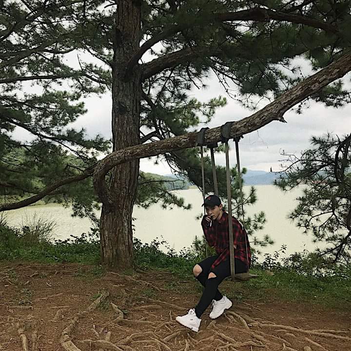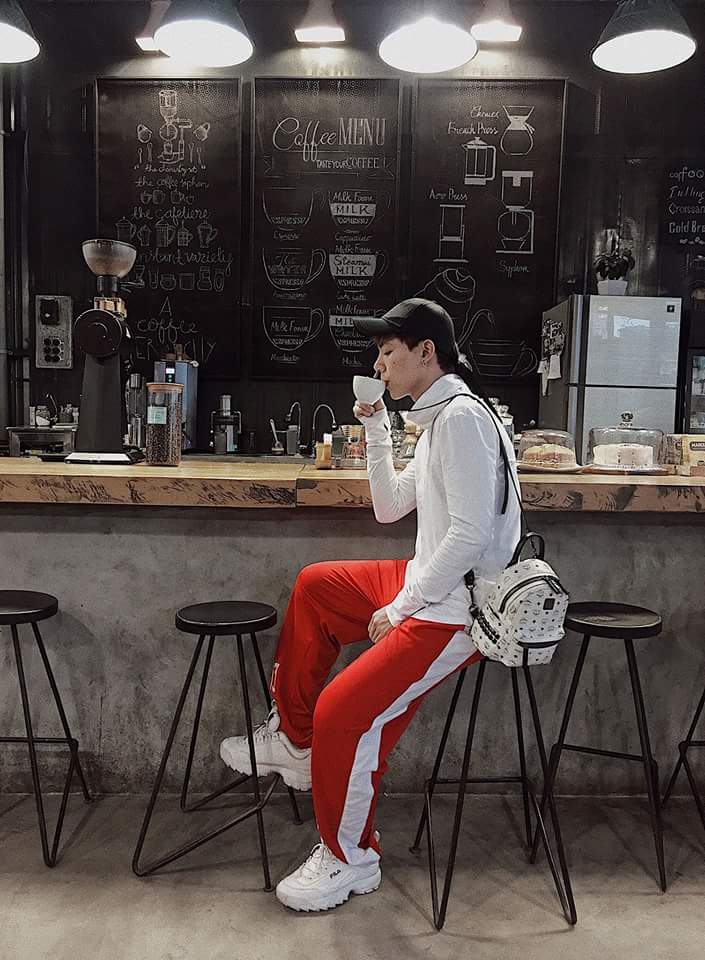 Hay quần đỏ sọc trắng ăn nhập cùng áo thun trắng. Anh theo kịp xu hướng giày Fila đang “làm mưa làm gió” trong cộng đồng Streetwear.