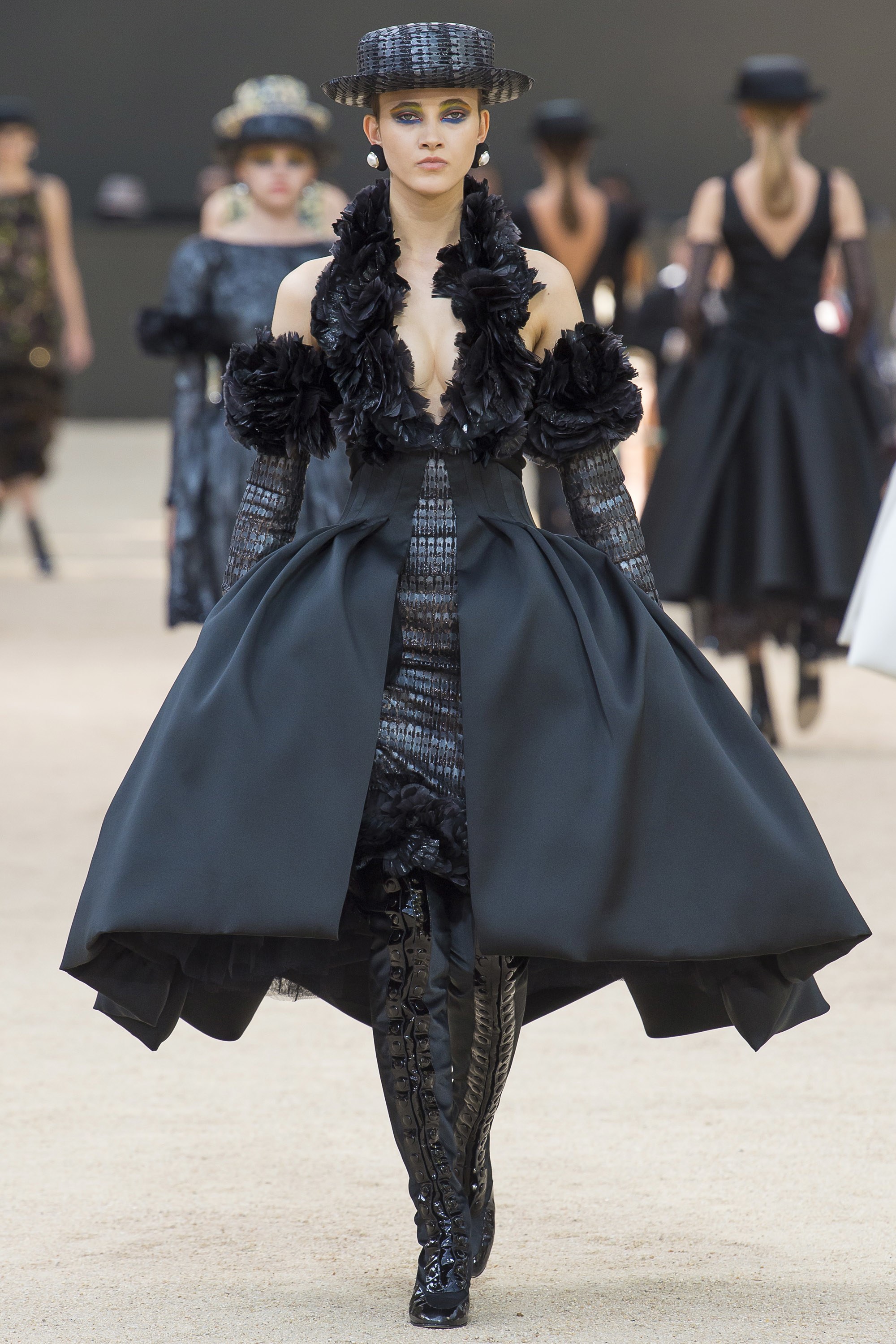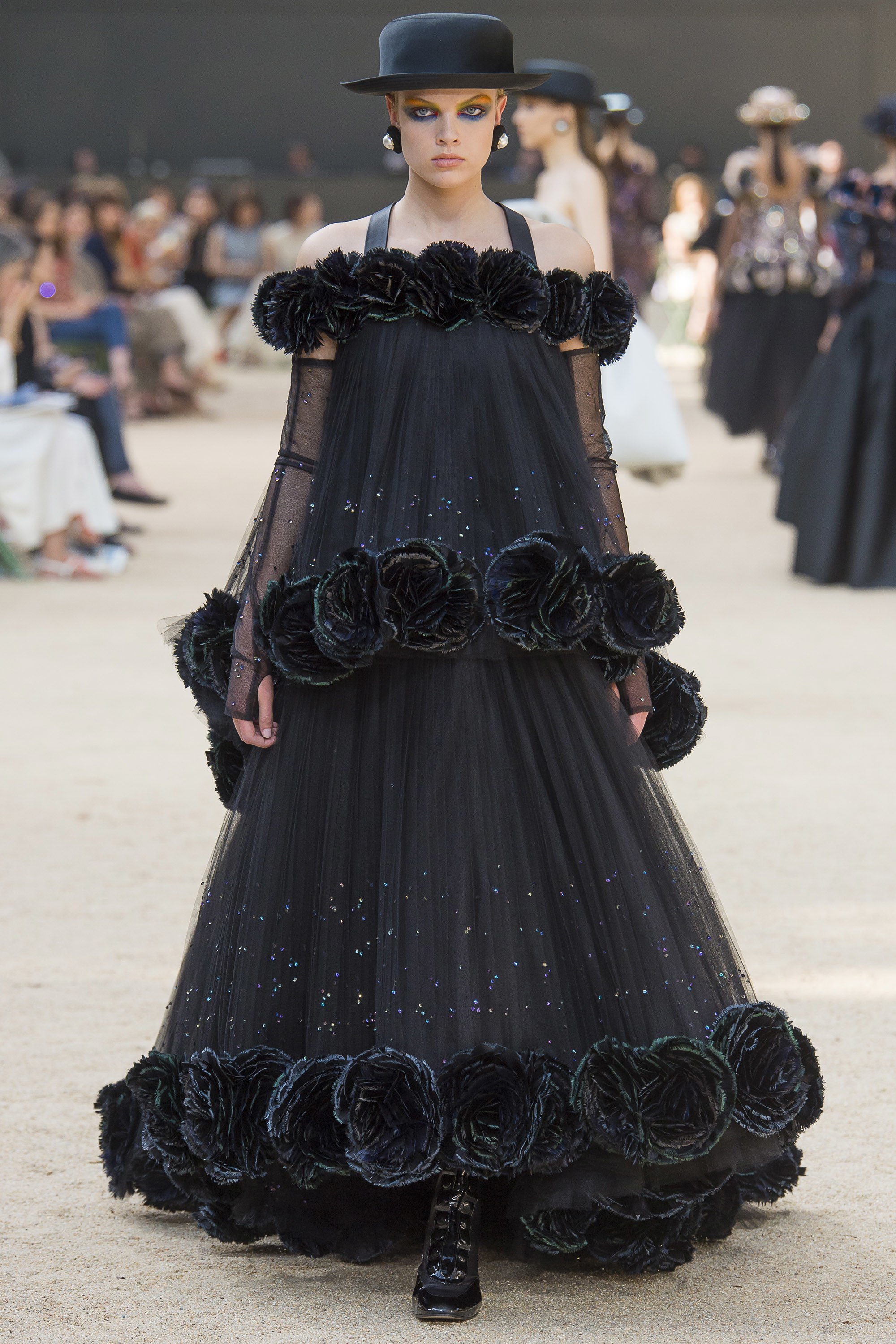 Với đầm dạ hội, Chanel ưu tiên chất liệu vải satin trơn mịn. Các chi tiết trên váy cầu kỳ nhưng gọn gàng. Chiếc đầm bồng bềnh này bật lên hình ảnh của phượng hoàng đen quyền lực. Mọi chi tiết đều trở nên vừa đủ thay vì cảm giác diêm dúa rất dễ vấp phải khi sử dụng phom dáng và chất liệu này.