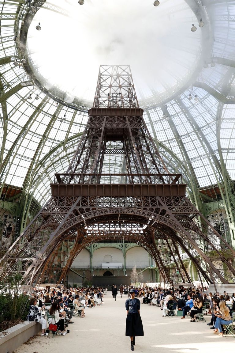 Vốn xưa nay nhà mốt Chanel luôn có sự đầu tư không gian kiến trúc cho mỗi bộ sưu tập. Xuân Hè Haute Couture 2017 là nhà gương tráng lệ, Thu Đông 2017 Ready-to-wear là không gian du hành của tàu vũ trụ và với Thu Đông Haute Couture 2017 này, Chanel đã xây hẳn một tháp Eiffel thứ hai trong tòa nhà Grand Palais.