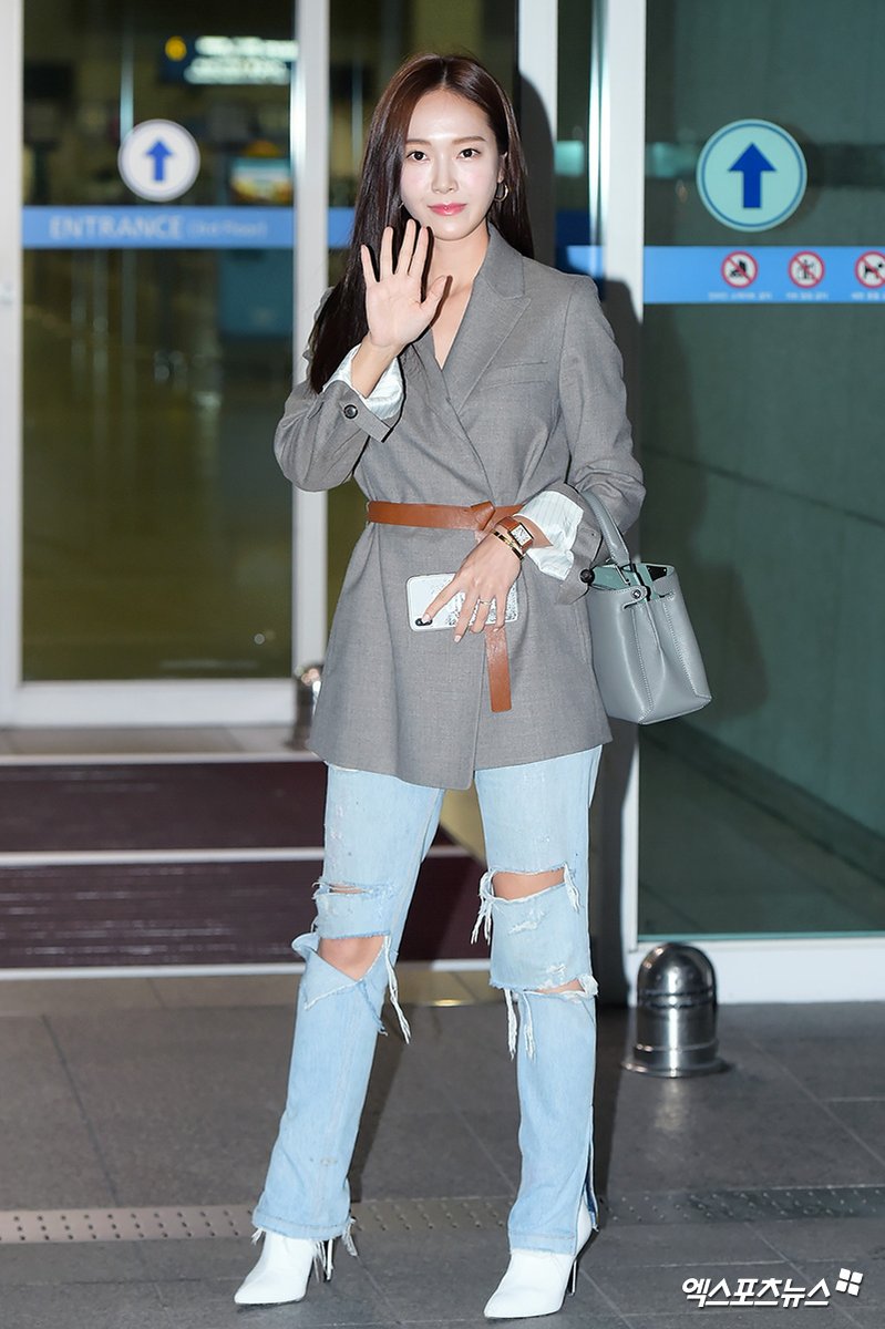 Jessica phối đồ thời trang sân bay bao gồm các item như blazer ghi xám , quần jeans rách, thắt lưng nâu, boot trắng và túi bucket. Thế nhưng, tổng thể nhìn lại không ăn nhập gì với nhau