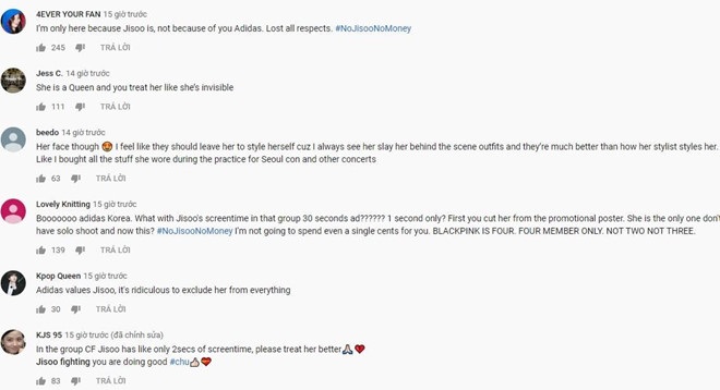 Nhìn kĩ từng clip solo cho từng thành viên nhóm được nhãn hàng update trên mạng. Nếu Lisa, Jennie hay Rosé lên hình khoảng 3 giây và được quay toàn cảnh và cận mặt rõ ràng theo từng góc thì riêng Jisoo chỉ có một giây đất diễn và góc quay không hề được “chải chuốt” như 3 thành viên còn lại. Chính vì điều đó đã khiến fan của visual nhóm đòi tẩy chay nhãn hàng Adidas ngay lập tức.