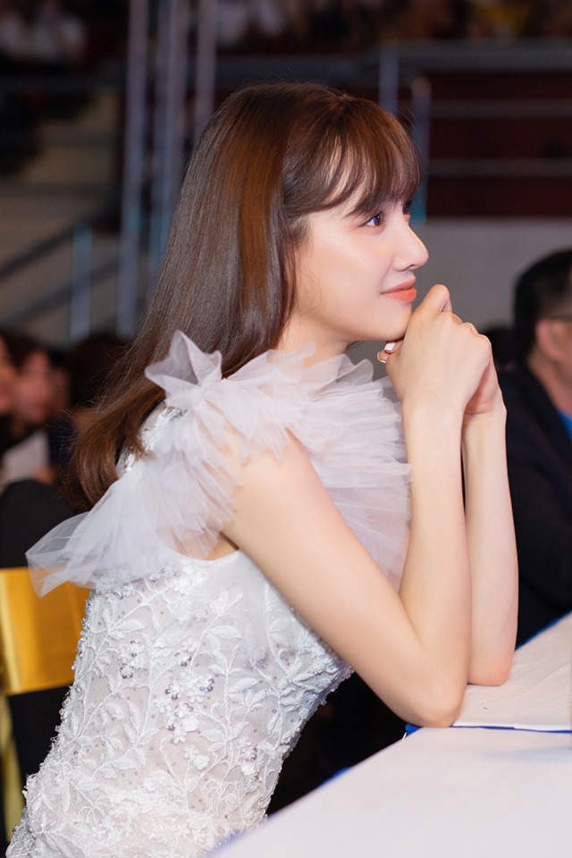 Mái tóc buông xõa nhẹ nhàng, cách trang điểm nhấn vào làn môi cam cũng tạo nên tổng thể phù hợp, khiến khán giả mê mẩn.