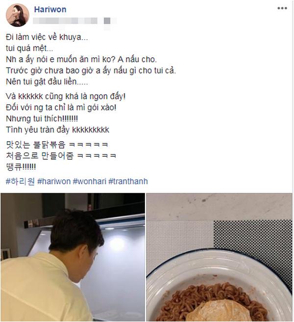 Mới đây, trên trang cá nhân của mình, Hari Won tiếp tục làm khán giả ghen tỵ khi khoe khoảnh khắc hạnh phúc khi được ông xã Trấn Thành chăm sóc. Cụ thể, cô chia sẻ: “Đi làm việc về khuya, người ấy hỏi muốn ăn mì không, anh nấu cho… đối với người ta chỉ là mì gói xào, nhưng tui thích… tình yêu tràn đầy!”.