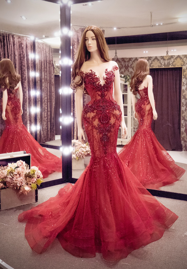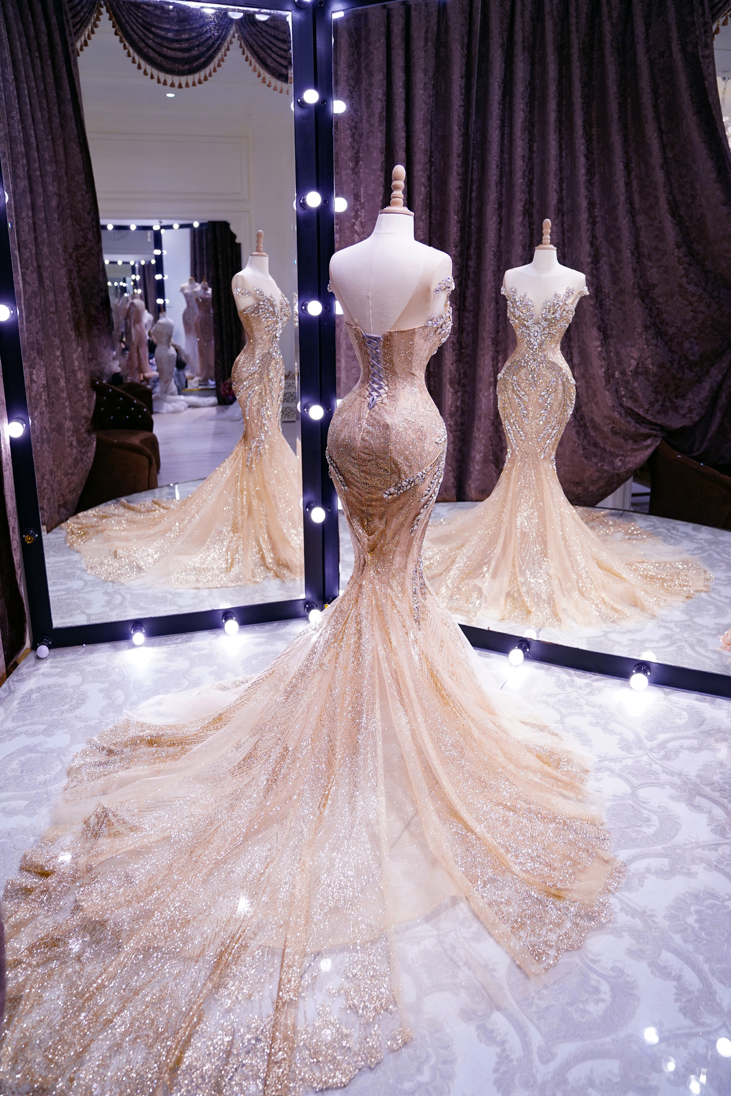 Chiếc đầm có thiết kế ôm sát thân hình, thể hiện được sự mềm mại của cơ thể. Thân váy được đính kết cầu kì bởi những nghệ nhân lành nghề trong suốt một tháng.