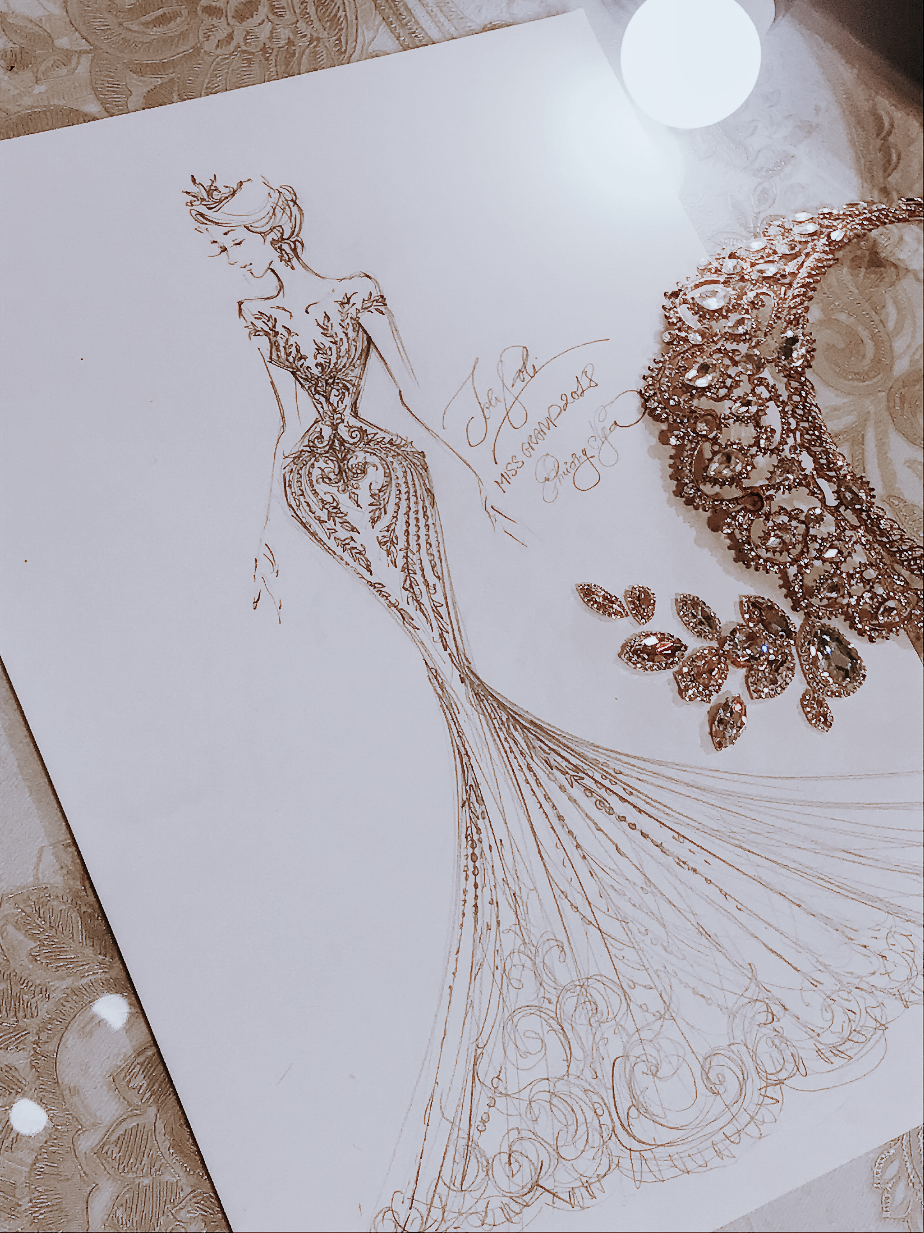 Theo tiết lộ từ ekip, chiếc đầm dạ hội Phương Nga diện trong đêm chung kết Miss Grand International 2018 được lấy ý tưởng từ đôi cánh kết hợp biểu tượng hạt ngọc vàng - cây lúa chín của Việt Nam.