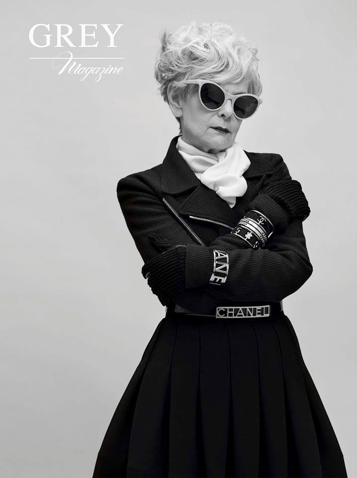 Fashionista 63 tuổi trở thành gương mặt trang bìa của tạp chí Grey. Với gu ăn mặc thời thượng, vượt qua giới hạn tuổi tác.
