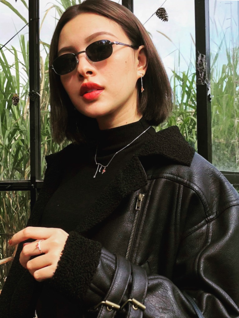 Cũng chọn sắc đen và bộ trang sức hồng hạc, Tú Hảo lại mang đến một phong cách cool ngầu thời thượng với áo len cổ lọ, áo khoác da, quần họa tiết da báo kết hợp cùng kính mát retro hợp xu hướng.