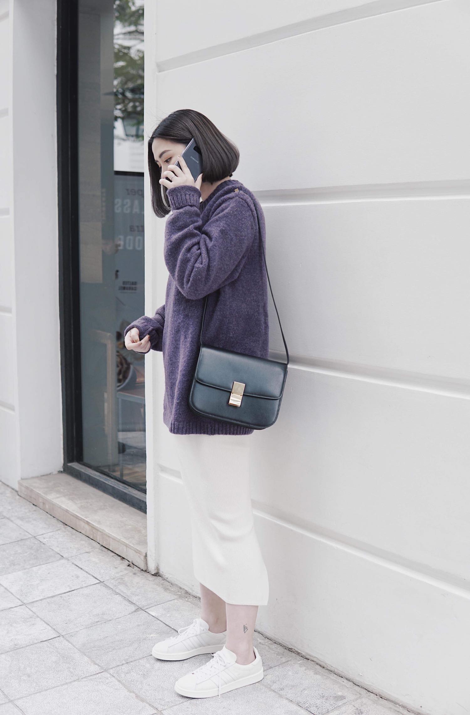 Ngay cả với một set đồ vô cùng “an toàn” áo len over size kết hợp cùng chân váy bút chì và sneaker trắng, chính sắc tím là nhân tố giúp cô nàng fashionista nổi bật khi xuống phố.