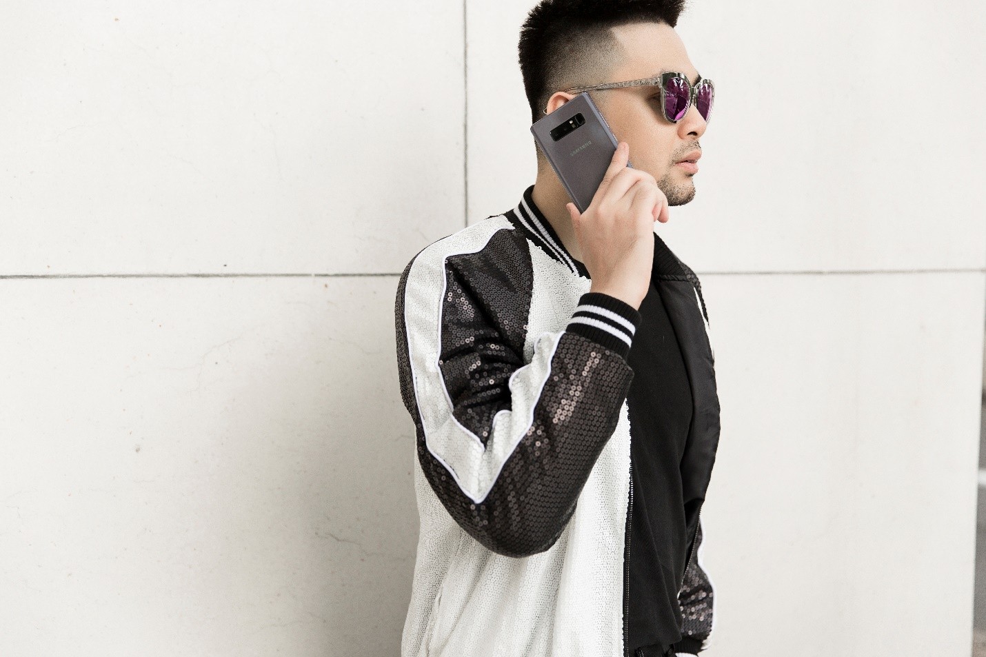 Là một BTV thời trang và cũng là một fashionista đình đám trong làng thời trang Việt, Long Ichi chắc chắn không thể bỏ lỡ xu hướng đình đám bằng cách bổ sung cho mình món phụ kiện Galaxy Note8 phiên bản Tím Khói cho từng set trang phục. Không cần quá cầu kỳ, phong cách street style đơn giản với sắc màu chủ đạo trắng - đen (black - white) cũng đủ thu hút mọi ánh nhìn nhờ điểm nhấn là chiếc kính mát ánh tím cực độc và phụ kiện công nghệ Galaxy Note8 màu tím khói thời thượng.