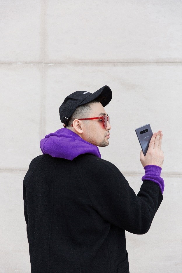 Set đồ “cơ bản” kết hợp áo hoodie nỉ cùng áo dạ dáng dài. Galaxy Note8 Tím Khói khiến phong cách của Long Ichi trở nên bắt mắt và cực kỳ cá tính. Không chỉ các bạn nữ, nhiều bạn nam cũng có thể chọn sắc Tím Khói là điểm nhấn cực “chất” cho phong cách của mình.