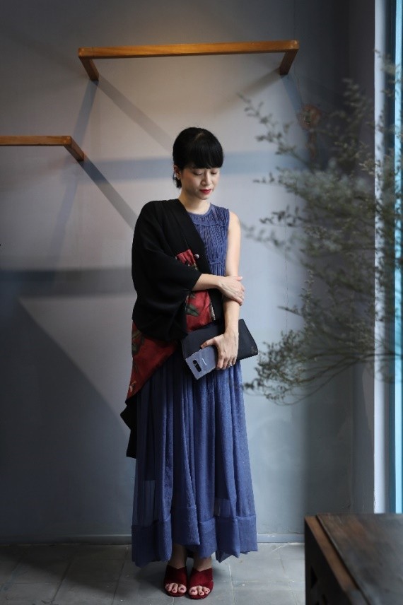 Áo khoác phong cách Kimono kết hợp cùng chiếc váy suông dài và Galaxy Note8 Tím Khói tạo nên nét thanh lịch nhưng vô cùng lạ lẫm và ấn tượng.