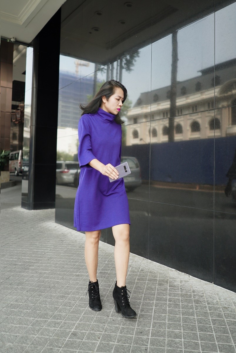Riêng Giám đốc của tạp chí L’Officiel - Nguyễn Ngọc Phương, cô tối giản hóa set trang phục khi phối chiếc váy suông màu tím và đôi boot đen cá tính. Với sự nổi bật sẵn có, chỉ cần một chi tiết nhỏ hoặc phụ kiện tím khói đi kèm như Galaxy Note8 sẽ tạo nên điểm nhấn giúp tổng thể tỏa sáng. Chỉ bấy nhiêu thôi cũng tạo nên một phong cách vô cùng đẳng cấp và quyền lực.