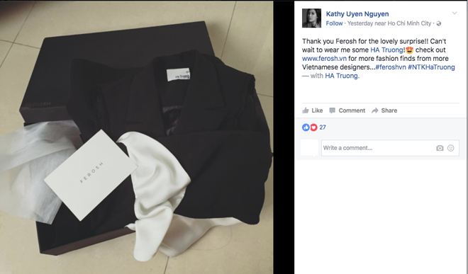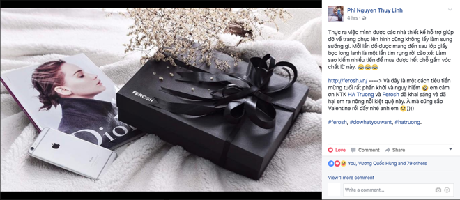 Diễn viên Kathy Uyên cũng dành tặng những lời có cánh cho NTK Hà Trương và hộp giao hàng cao cấp của Ferosh.