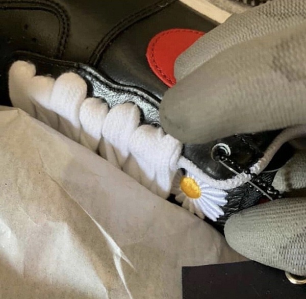 Đôi giày có gắn logo bông cúc của thương hiệu thời trang PEACEMINUSONE được sở hữu bởi chính anh.