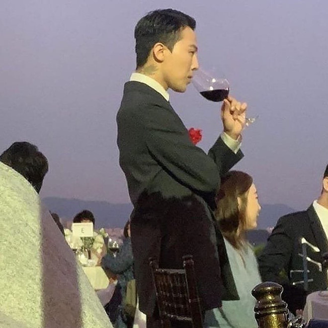 Phong cách thời trang lúc nào cũng “đỉnh” chỉ với bộ suit đơn điệu tại tiệc cưới, anh đã tô điểm cho trang phục của mình bằng một bông hoa đỏ hồng trên áo