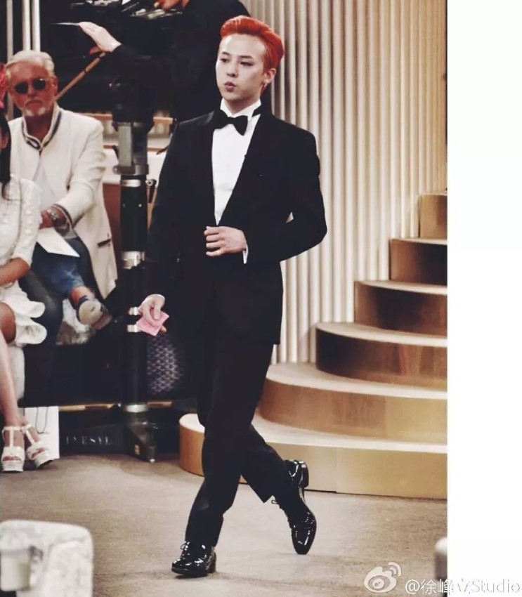 Tham dự show diễn Thu-Đông 2015 của Chanel, anh vô cùng lịch lãm với bộ suit đen, giữa một dàn khách mời đông đảo thì G-Dragon quả là một trong những nhân vật nổi bật nhất với mái tóc đỏ rực cực kì ấn tượng