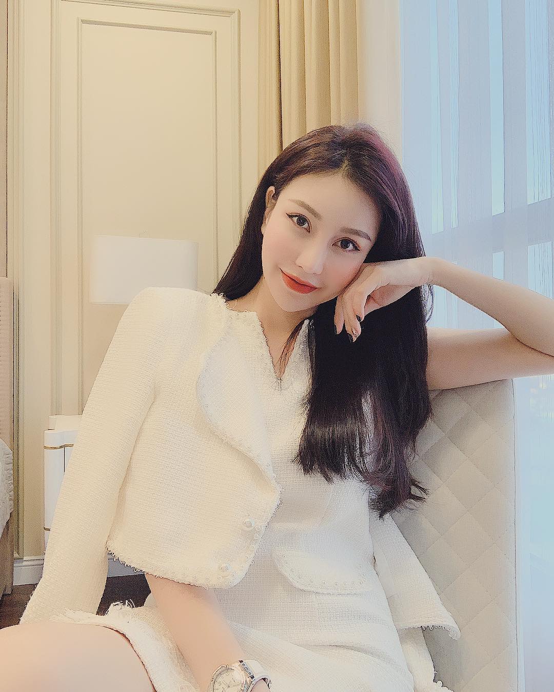 Thời thượng, sang trọng và lịch lãm là những gì người ta có thể nhận thấy khi nhìn vào set đồ này của hoa hậu Lam Cúc.