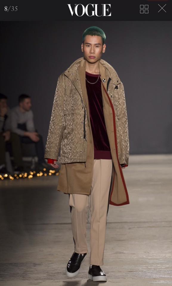 Sau mỗi show diễn, hình ảnh của Fuji ngay lập tức xuất hiện trên tạp chí thời trang lừng danh làng mốt - Vogue. Anh chàng tự tin sải bước trong BST mùa thu 2017 của thương hiệu Ovadia and Sons.