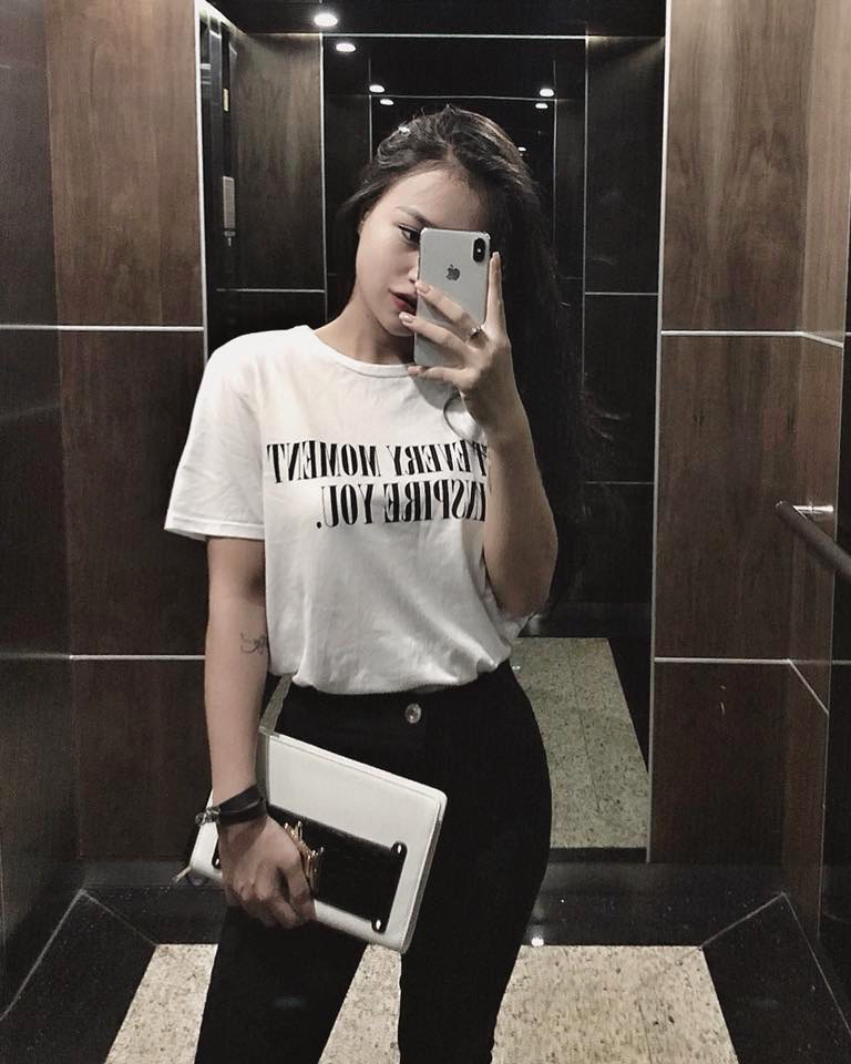 Vẫn là thiết kế ấy nhưng với màu trắng, chiếc clutch đã trở thành điểm nhấn cho bộ trang phục black-on-black của Yumi Thiên Nga.