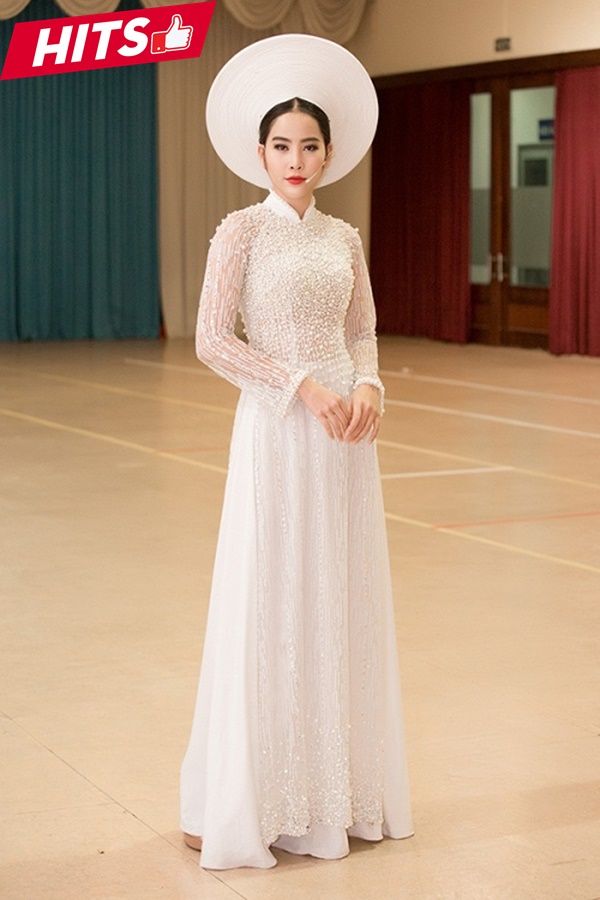 Nam Em dịu dàng, nữ tính trong thiết kế áo dài trắng muốt. Chi tiết đính hạt thân áo giúp chiếc váy bớt đơn điệu hơn. Chọn lối make up vừa phải với son môi đỏ giúp cô càng tôn lên vẻ ngọt ngào, cuốn hút.