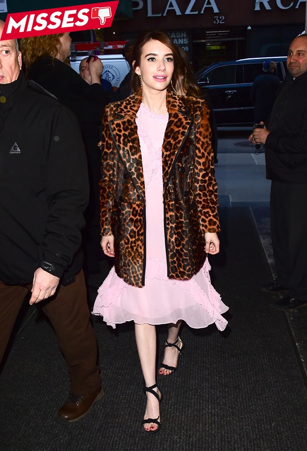 Emma Roberts sai quá sai cho cách mix cáo trench coat họa tiết da báo cùng chiếc váy điệu đà màu hồng với chân váy loe đuôi cá. 2 items phản tác dụng khi kết hợp chúng trên cùng một outfit.