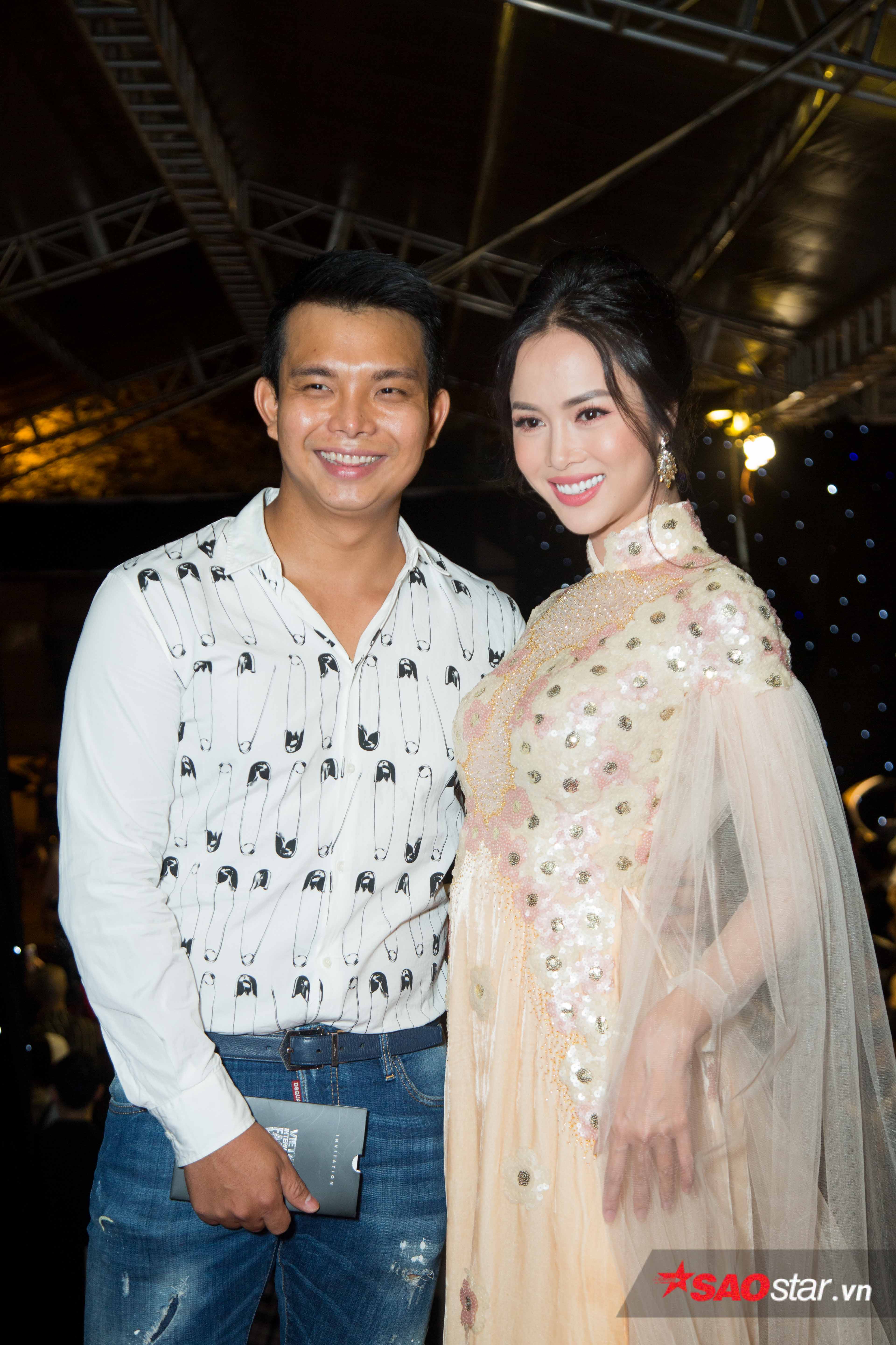 Người đẹp Quỳnh Hương đẹp nền nã trong tà áo dài cổ vuông sánh bước cùng ông bầu Vũ Khắc Tiệp.
