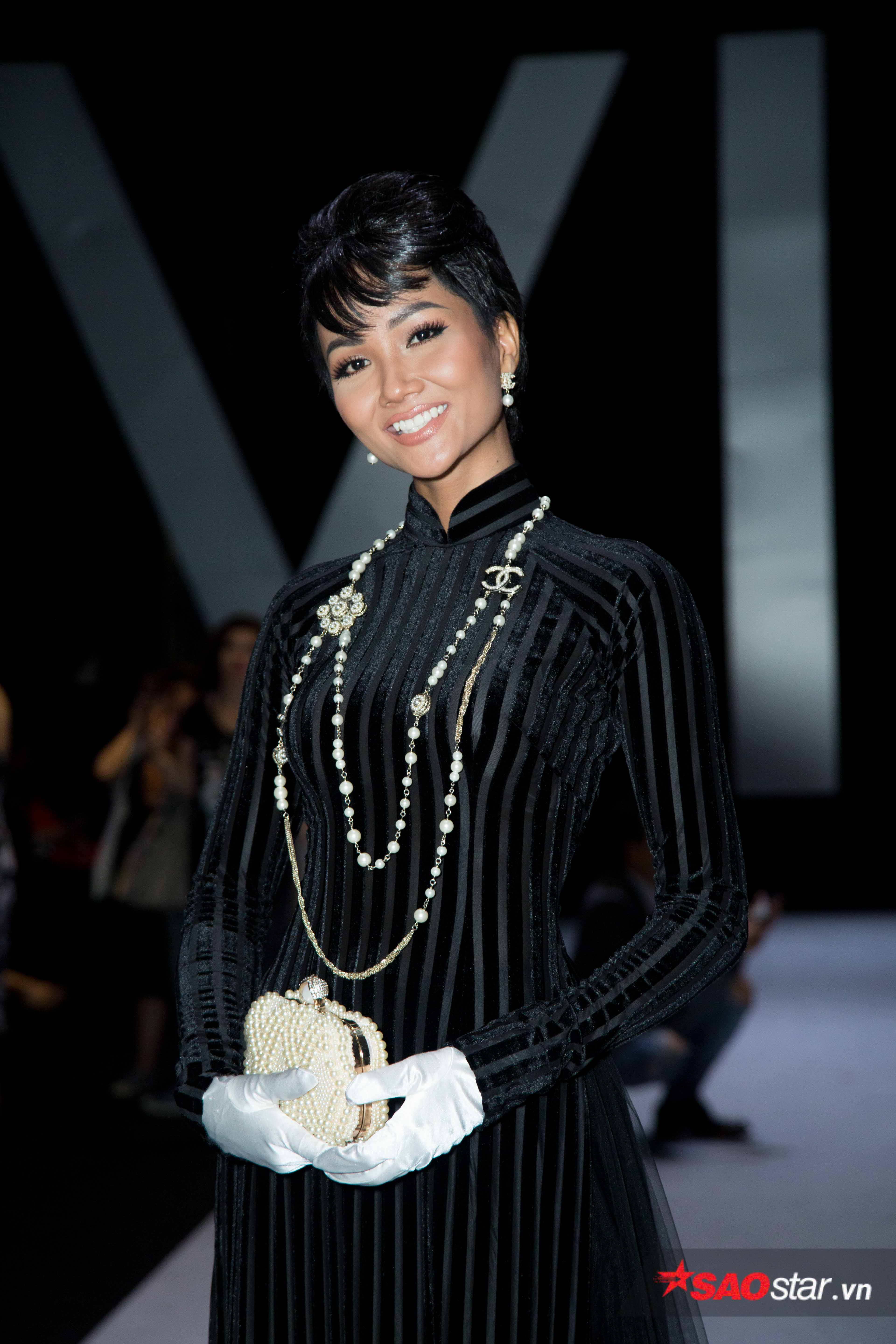 Lần thứ 2 đến dự VIFW 2018, Hoa hậu H'Hen Niê chuyển mình sang hình ảnh “mệnh phụ phu nhân” sang trọng đài các với bộ áo dài đen tuyền, tóc búi kiểu retro.