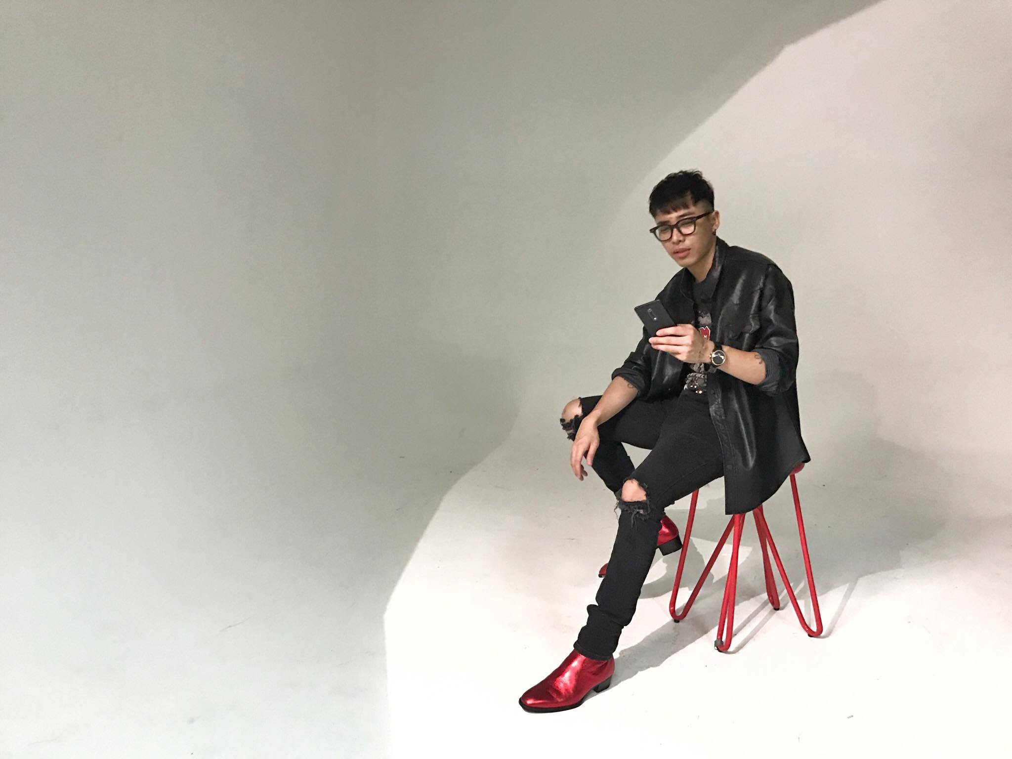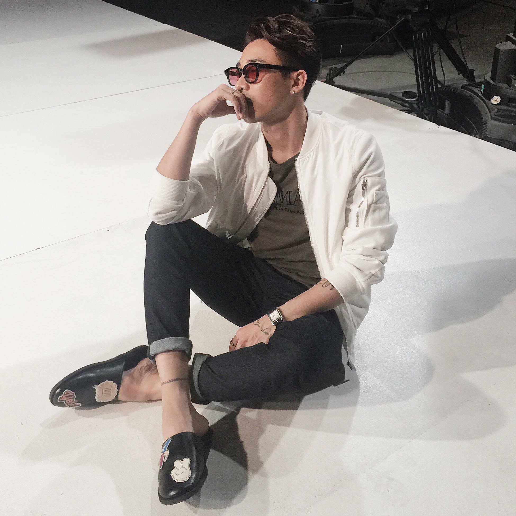 Hoạ tiết rắn chạy dọc thân giày là điểm nhấn độc đáo và “ăn tiền” khiến đôi loafer nhà Gucci có giá 17 triệu đồng. Ton-sur-ton nguyên cây đen nhưng chàng stylist vẫn ghi điểm tuyệt đối nhờ vào sắc đỏ ăn rơ từ cặp đôi cổ áo và biểu tượng Kingsnake.