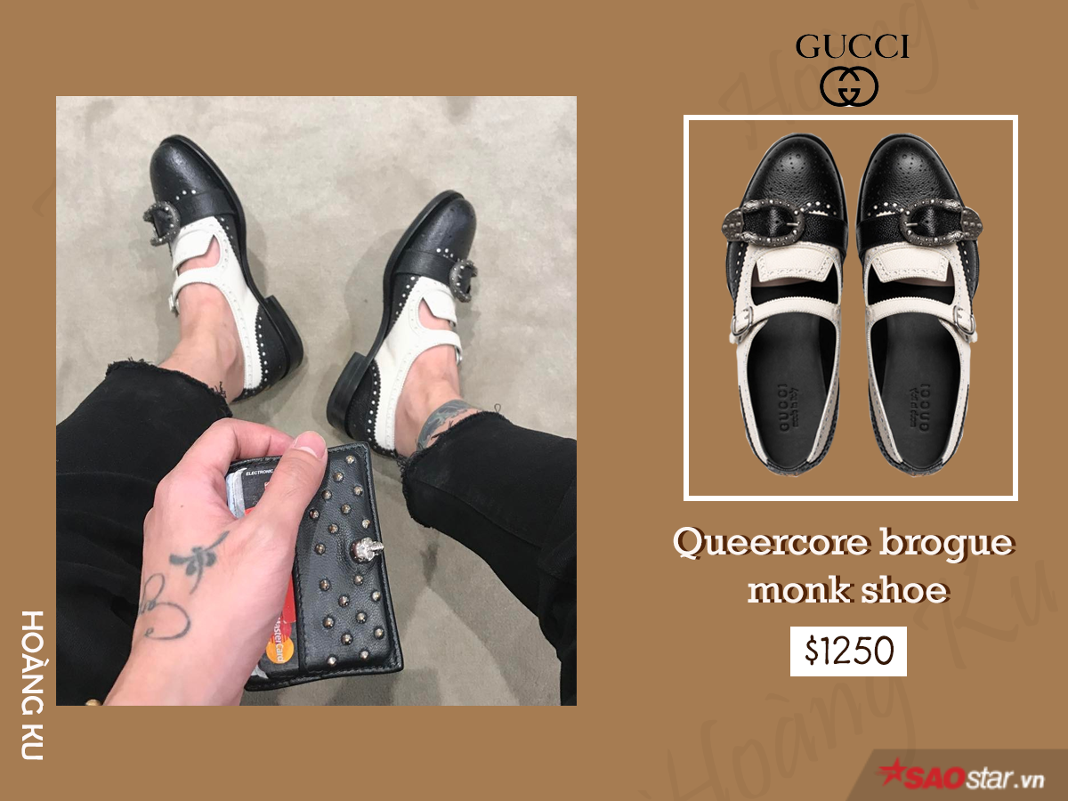 Tuy lọt top những đôi giày đắt đỏ nhất mà nhà mốt Gucci từng ra mắt thế nhưng điều này chẳng làm stylist Hoàng Ku ngần ngại, anh chàng đã nhanh tay rước ngay đôi Queercore brogue monk shoe về tô điểm cho tủ đồ hiệu của mình.